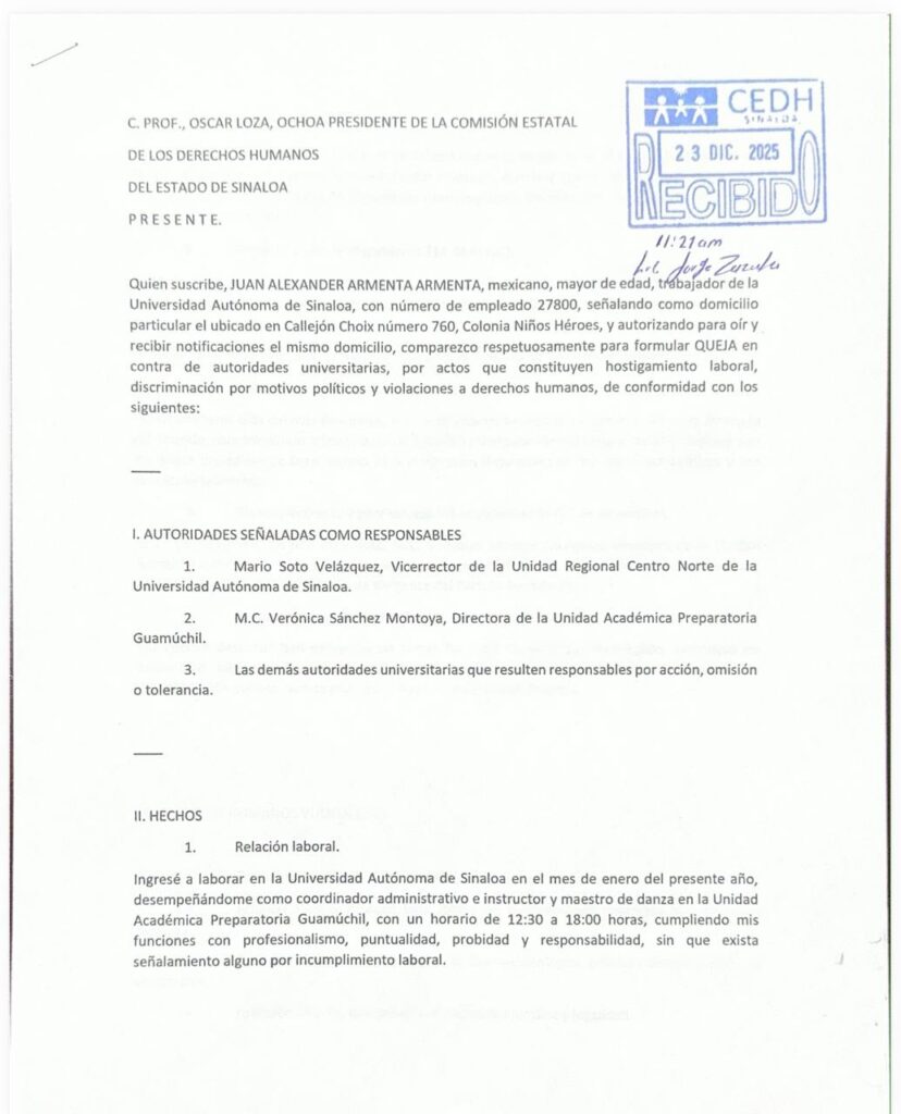 Alexander Armenta, presidente de la dirigencia municipal del Partido Sinaloense (PAS) en Salvador Alvarado, denunció haber sido despedido de la Universidad Autónoma de Sinaloa (UAS), a pesar de que desde diciembre había presentado una queja formal por amenazas, hostigamiento laboral y discriminación política ante la Comisión Estatal de los Derechos Humanos del Estado de Sinaloa.